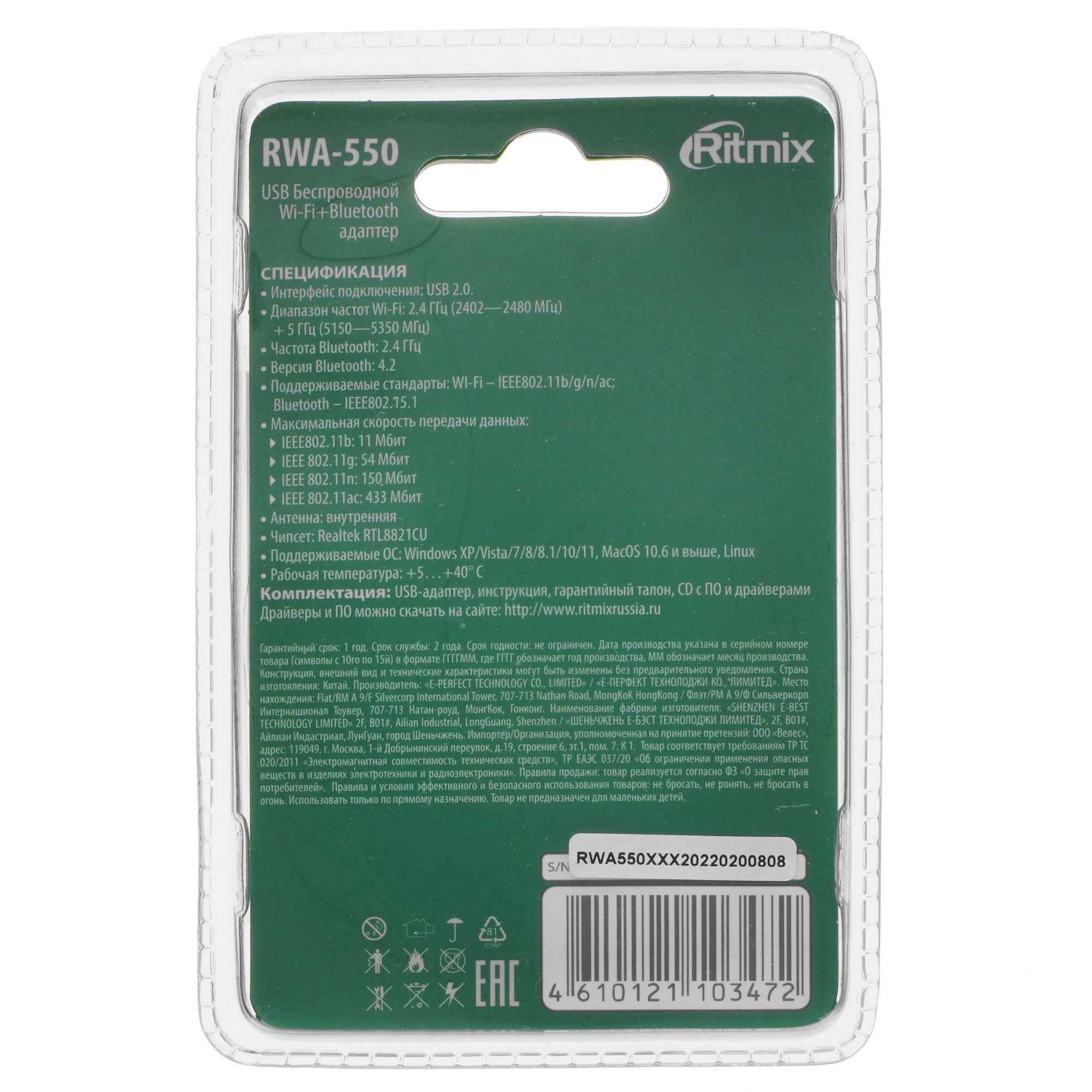 Wi-Fi адаптер + Bluetooth RITMIX RWA-550 – удобное приспособление, с помощью которого можно подключать ноутбуки и персональные компьютеры к интернету. Также с помощью Bluetooth 4.2 можно синхронизировать периферийные устройства.