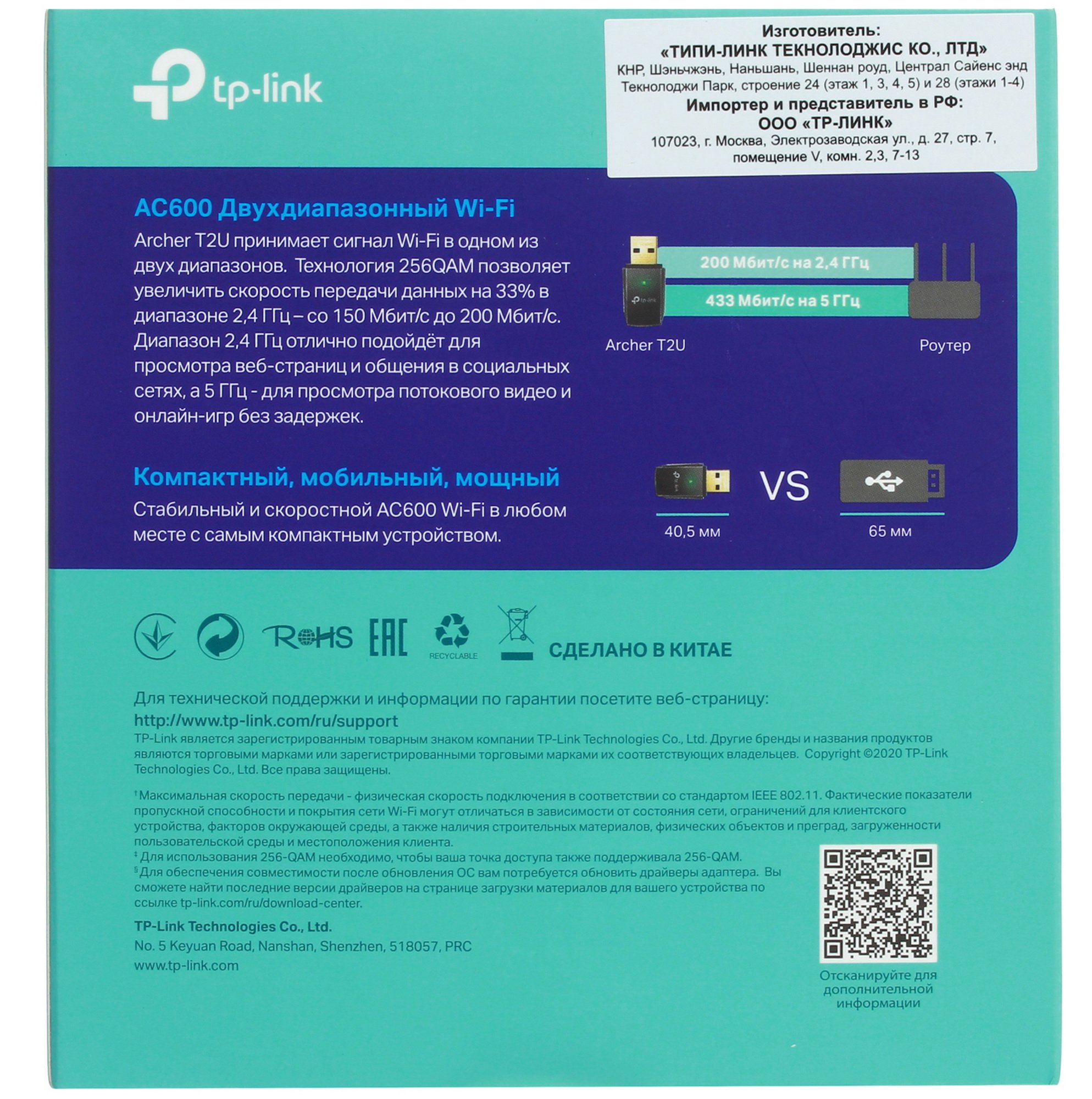 Wi-Fi адаптер TP-Link Archer T2U v3 представляет собой компактный внешний модуль, с помощью которого вы можете обеспечить беспроводной доступ к сети Интернет на вашем компьютере. Отличительной особенностью данной модели является возможность работы как в диапазоне 2.4 ГГц, так и в диапазоне 5 ГГц. Благодаря этому, а также поддержке классу Wi-Fi AC600 скорость передачи данных может достигать 433 Мбит/с. Мощность передатчика составляет 20 dBm, что вкупе со встроенной антенной обеспечивает стабильный сигнал.