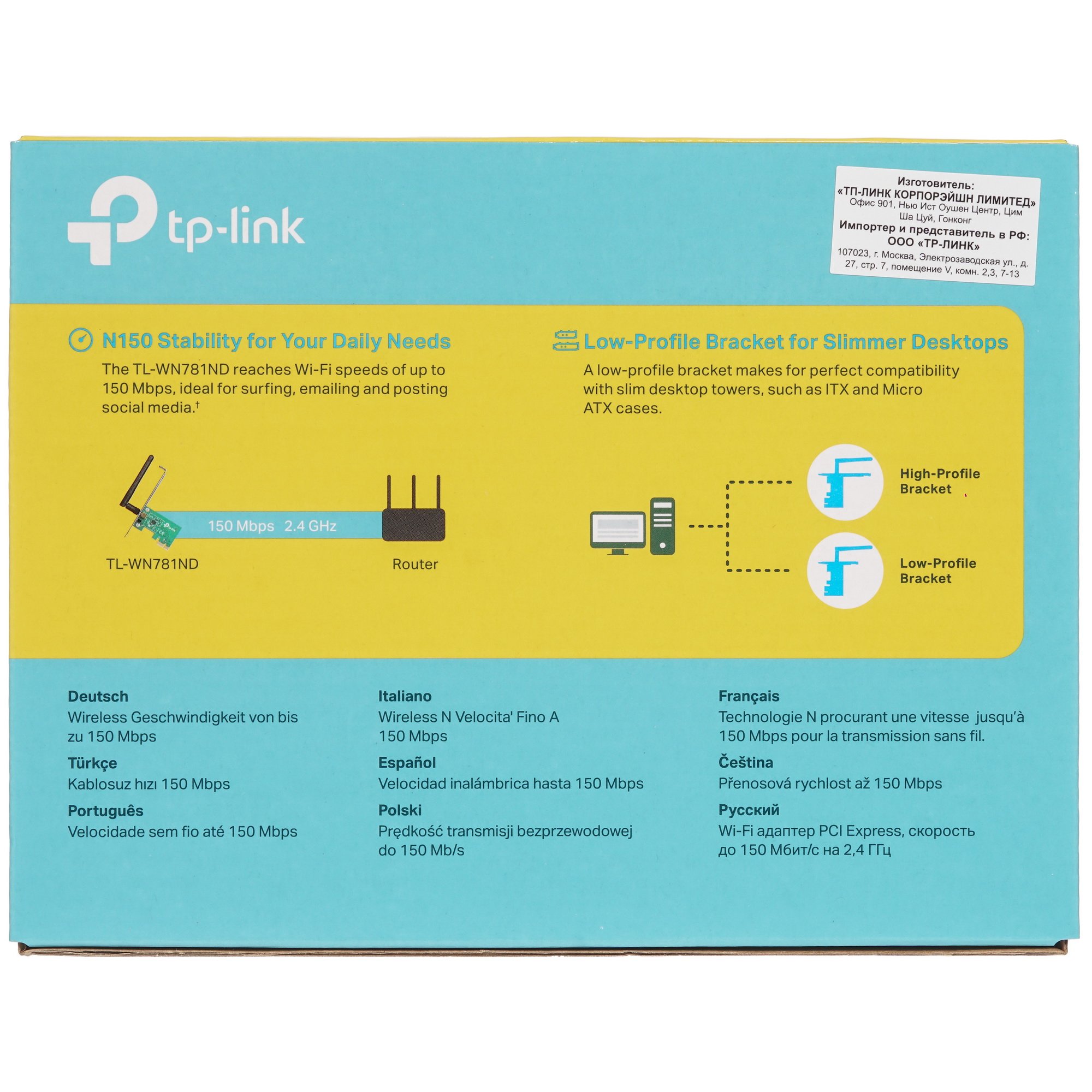Беспроводной адаптер TP-LINK TL-WN781ND работает на диапазоне частот до 2,4 ГГц, а скорость соединения при этом доходит до 150 Мбит/с. Адаптер обеспечивает высокое качество сигнала и большую пропускную мощность. Благодаря прямой передачи информации от сервера на устройство с PCI Express радиус передаваемого сигнала увеличился. TP-LINK TL-WN781ND - это мощный и надежный адаптер способный обеспечить качественный сигнал для воспроизведения потокового видео или загрузки файлов. Адаптер обеспечивает защиту данных с помощью WPA/WPA2 шифрования.