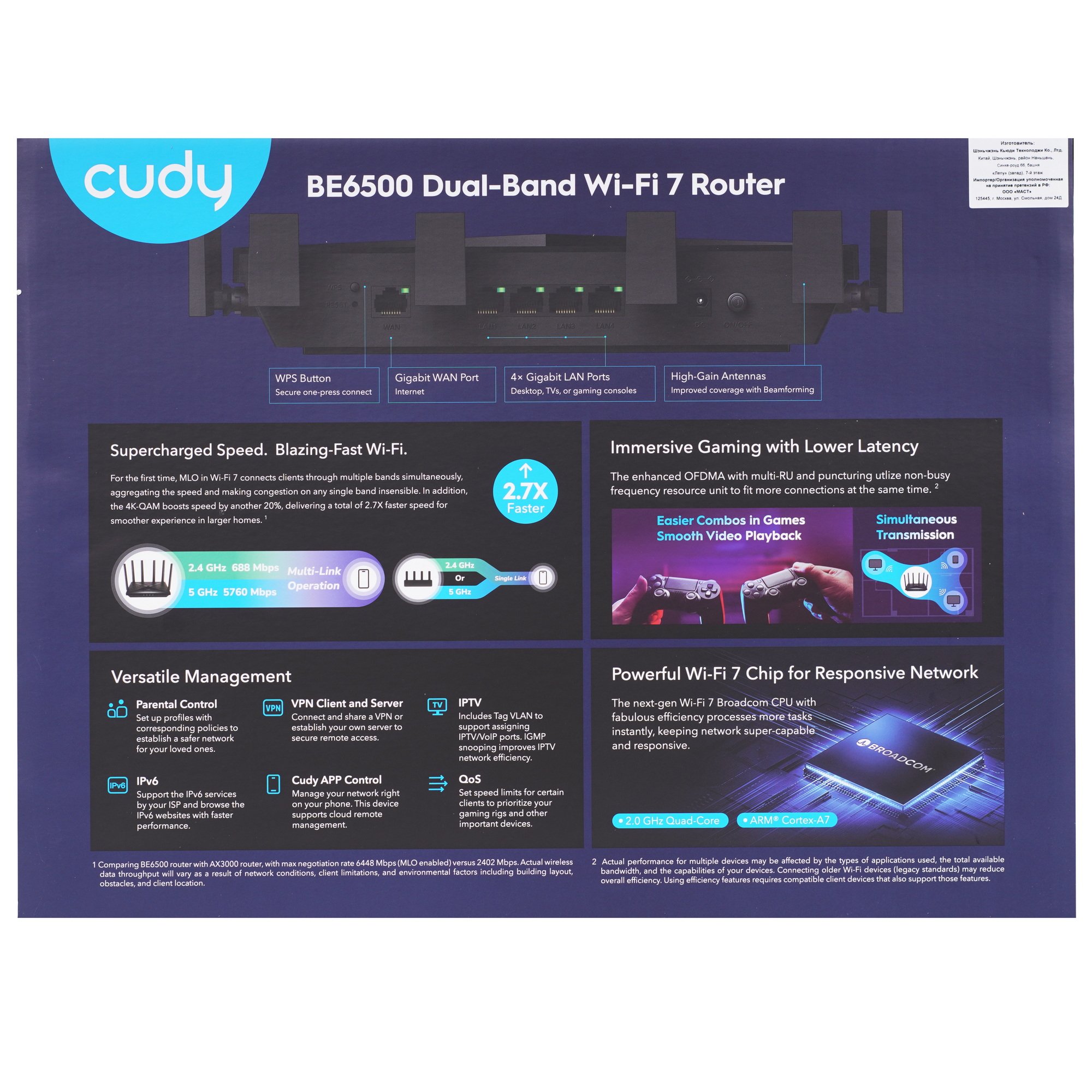 Wi-Fi роутер Cudy WR6500 – двухдиапазонный маршрутизатор WiFi 7 с общей скоростью 6,5 Гбит/с и пятью гигабитными портами, обеспечивающий сверхскоростной доступ в Интернет, игры и развлечения.