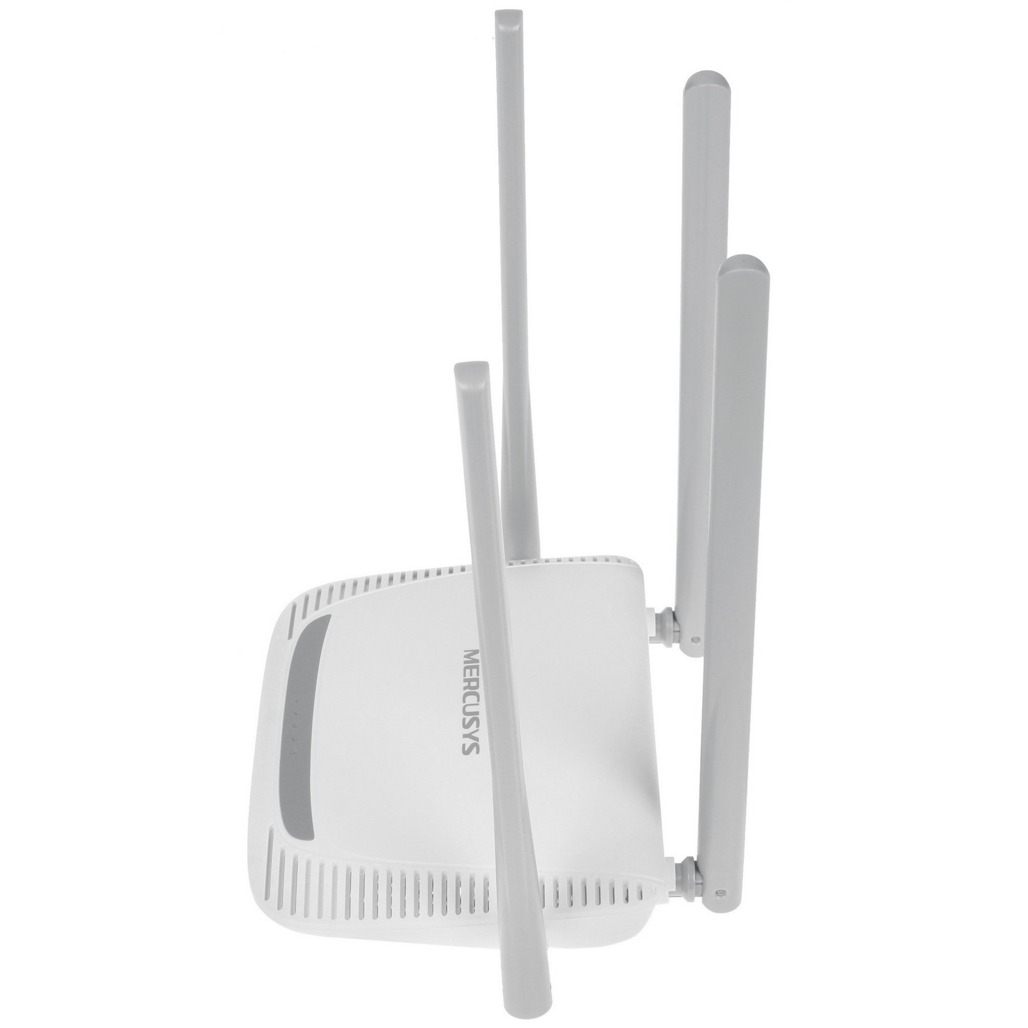 Маршрутизатор Mercusys MW325R – самодостаточное устройство для передачи интернет-сигнала. Для этого пластиковый белый корпус прибора оснащен 4 несъемными антеннами. Коэффициент усиления антенн достигает показателя в 5 dBi, а мощность передатчика составляет 20 dBM.