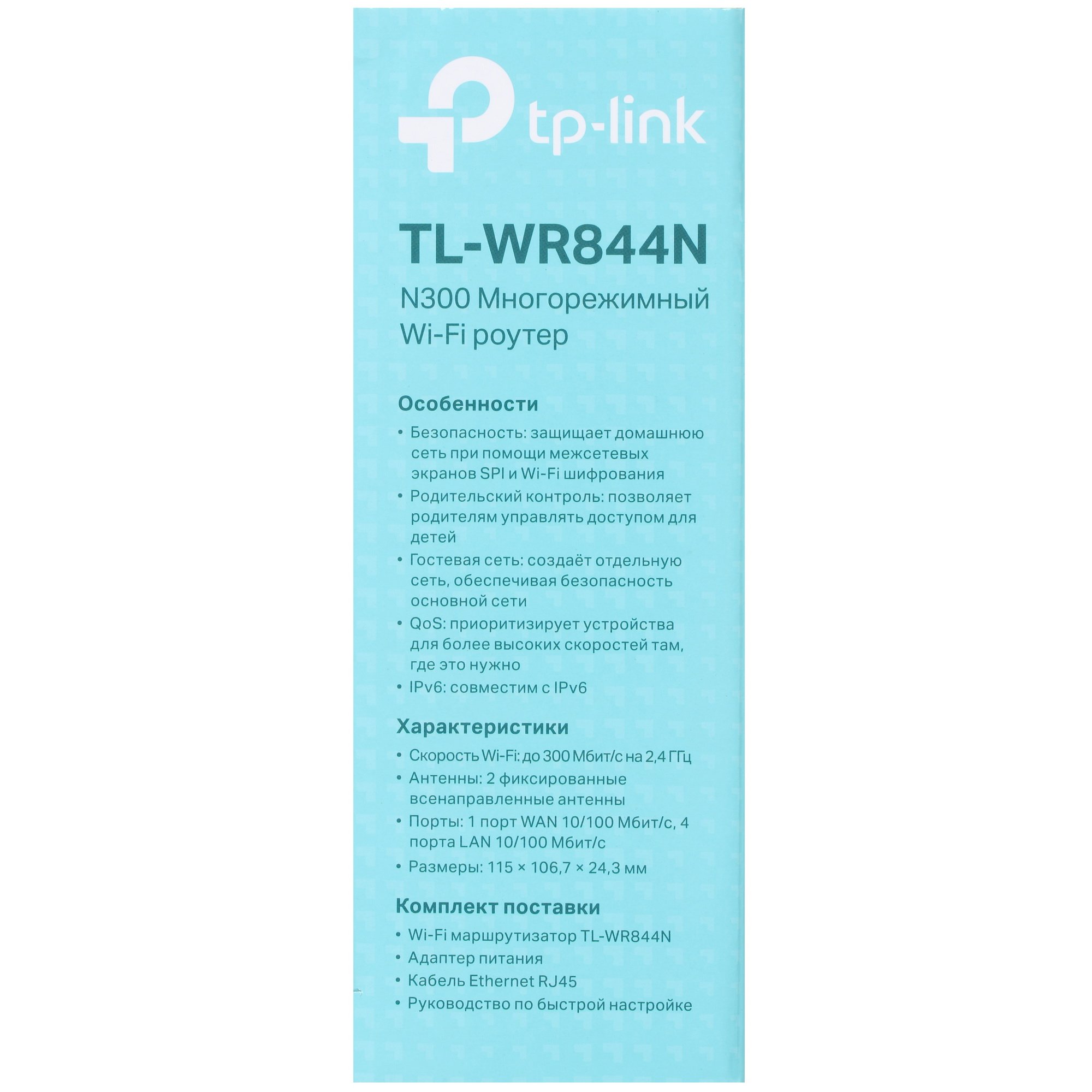 Wi-Fi роутер TP-LINK TL-WR844N отличается простотой настройки и администрирования за счет поддержки Web-интерфейса и мобильного приложения TP-LINK Tether. Для работы используется сеть 220 В. Комплектация включает в себя адаптер питания и кабель Ethernet.