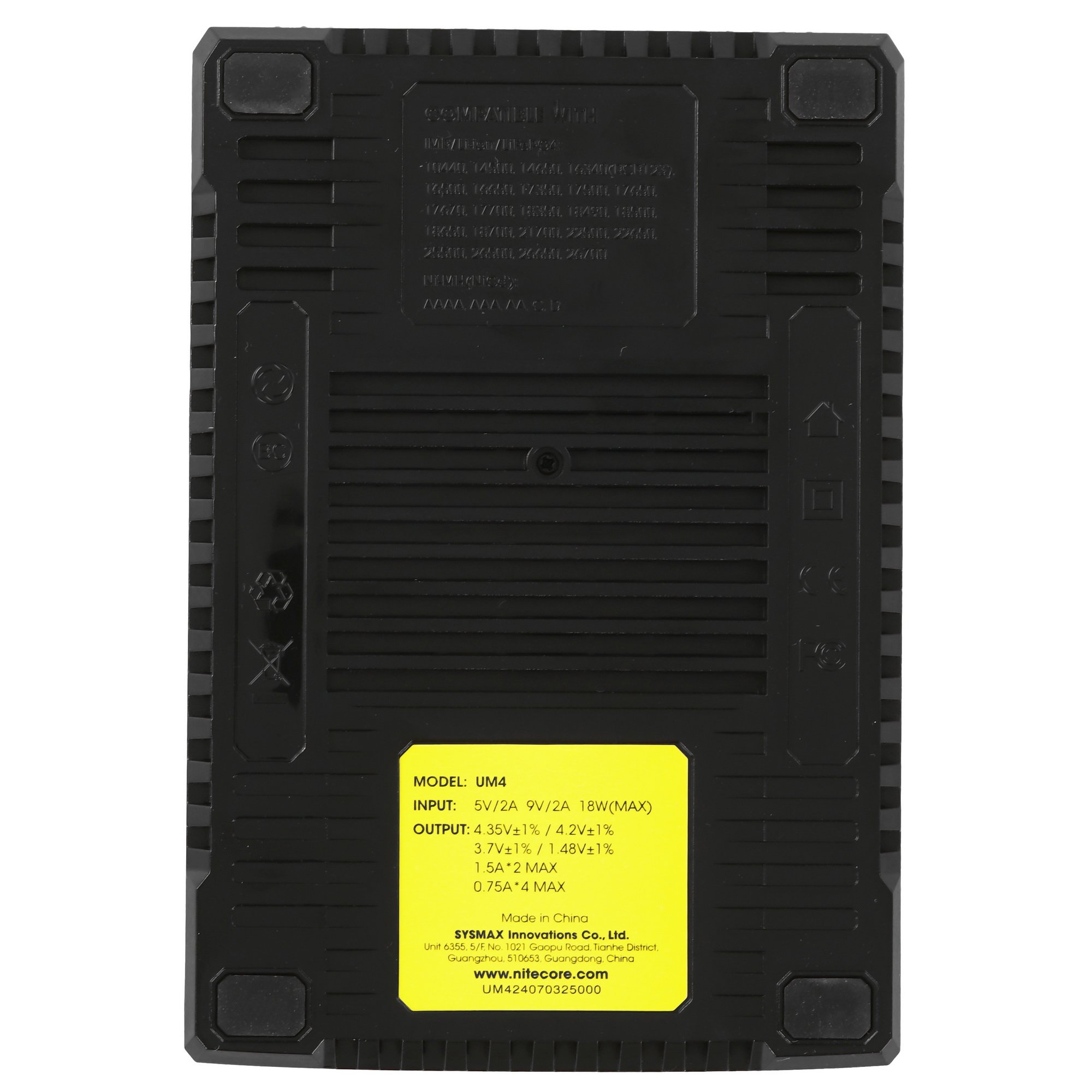 Зарядное устройство NITECORE UM4 подходит для подзарядки литий-ионных, никель-металлогидридных, никель-кадмиевых, литий-железо-фосфатных, а также IMR-аккумуляторов с типоразмером 10440, 14500, 14650, 16340 (RCR123), 16500, 16650, 17350, 17500, 17650, 17670, 17700, 18350, 18490, 18500, 18650, 18700, 20700, 21700, 22500, 22650, 25500, 26500, 26650, 26700, AA, AAA, AAAA, C, D. Конструкция модели включает 4 слота для аккумуляторов с индивидуальным каналом. Защитная технология исключает риск перегрева, переполюсовки, короткого замыкания.