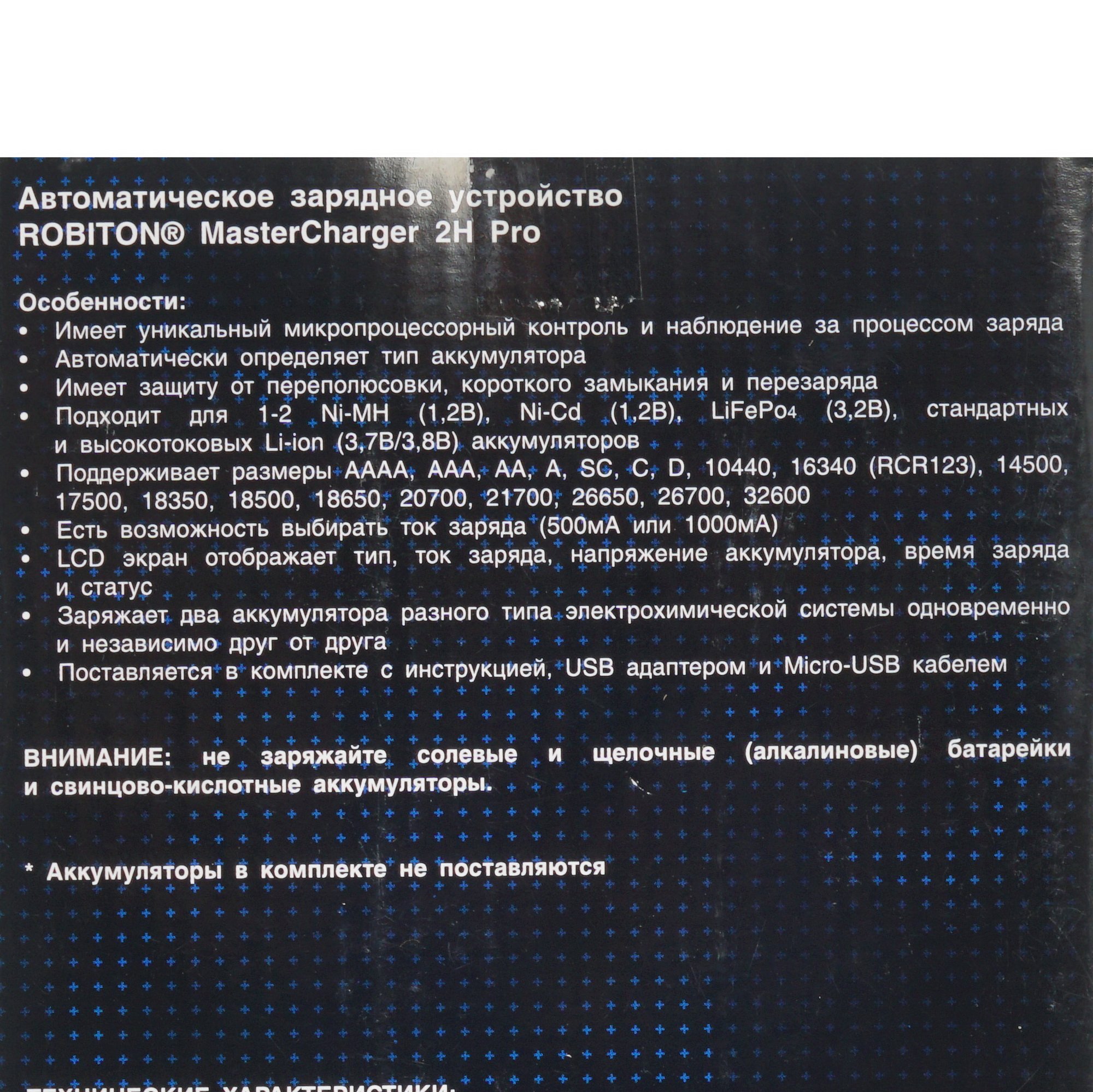 Зарядное устройство ROBITON MasterCharger 2H Pro – компактное и надежное решение для эффективной и безопасной подзарядки литиевых аккумуляторов разного типоразмера. Оно оборудовано двумя индивидуальными слотами и автоматически определяет тип аккумуляторной батареи при подключении. Над слотами расположен дисплей для просмотра текущих параметров состояния заряда. Технологии защиты от неправильной полюсовки и короткого замыкания гарантируют высокую безопасность ROBITON MasterCharger 2H Pro. В наборе предусмотрены сетевой адаптер и кабель USB.