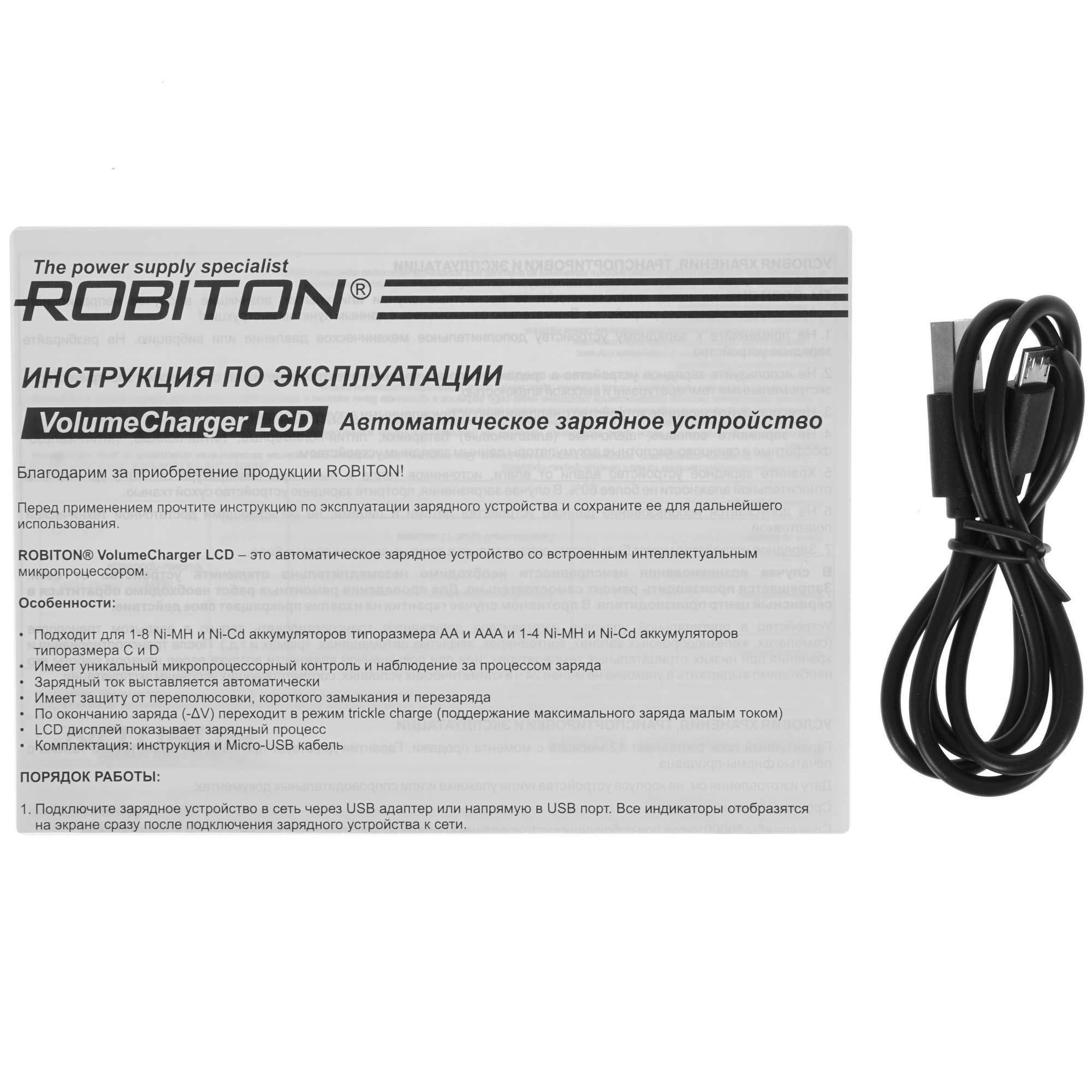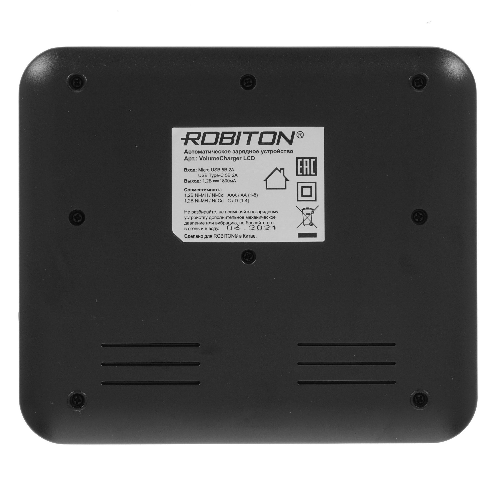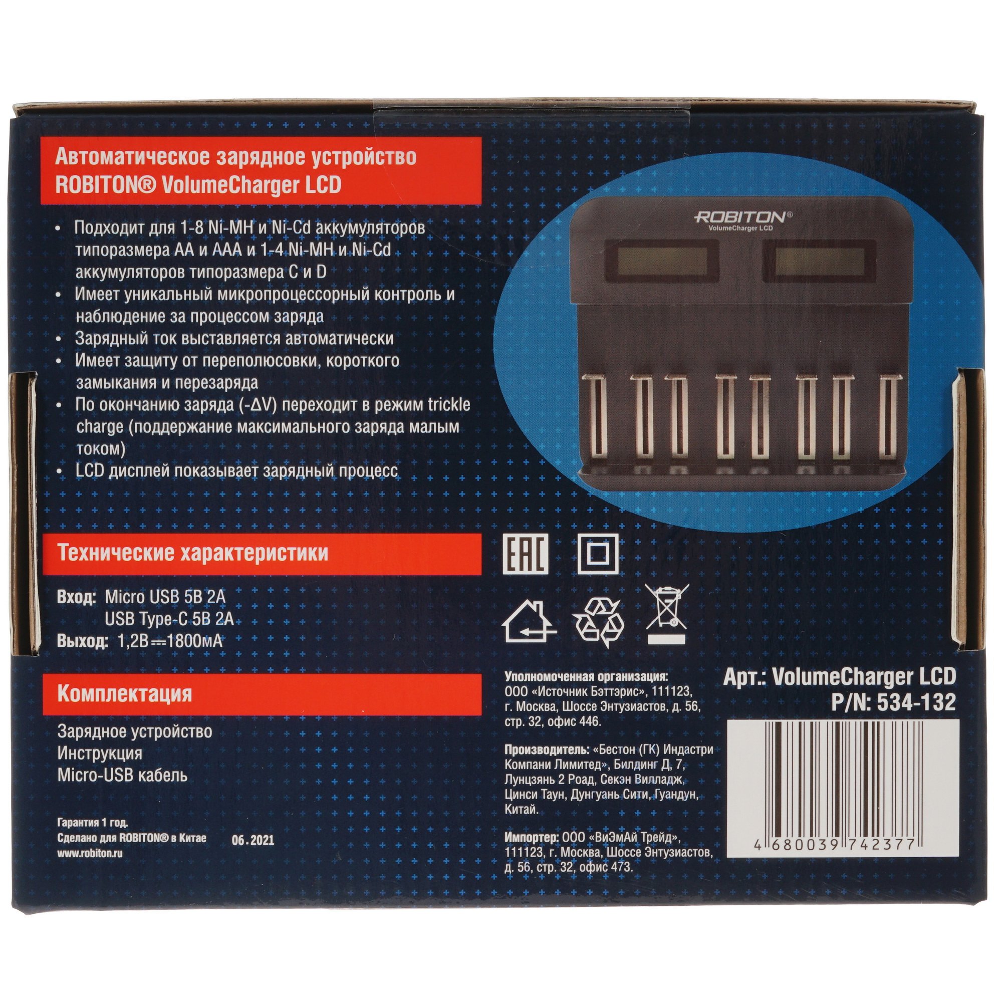 Зарядное устройство ROBITON VolumeCharger LCD представляет универсальное решение, которое позволяет выполнять подзарядку элементов питания типоразмеров AА, AAA, C, D и SC. Для размещения элементов питания в конструкции устройства предусмотрены 8 индивидуальных слотов. Данная модель отличается широким диапазоном напряжений и встроенными цифровыми дисплеями для контроля параметров заряда. Необходимый зарядный ток выставляется в автоматическом режиме. Также при достижении полного заряда устройство ROBITON VolumeCharger LCD переходит в режим малого тока для безопасного хранения аккумуляторов в слотах.