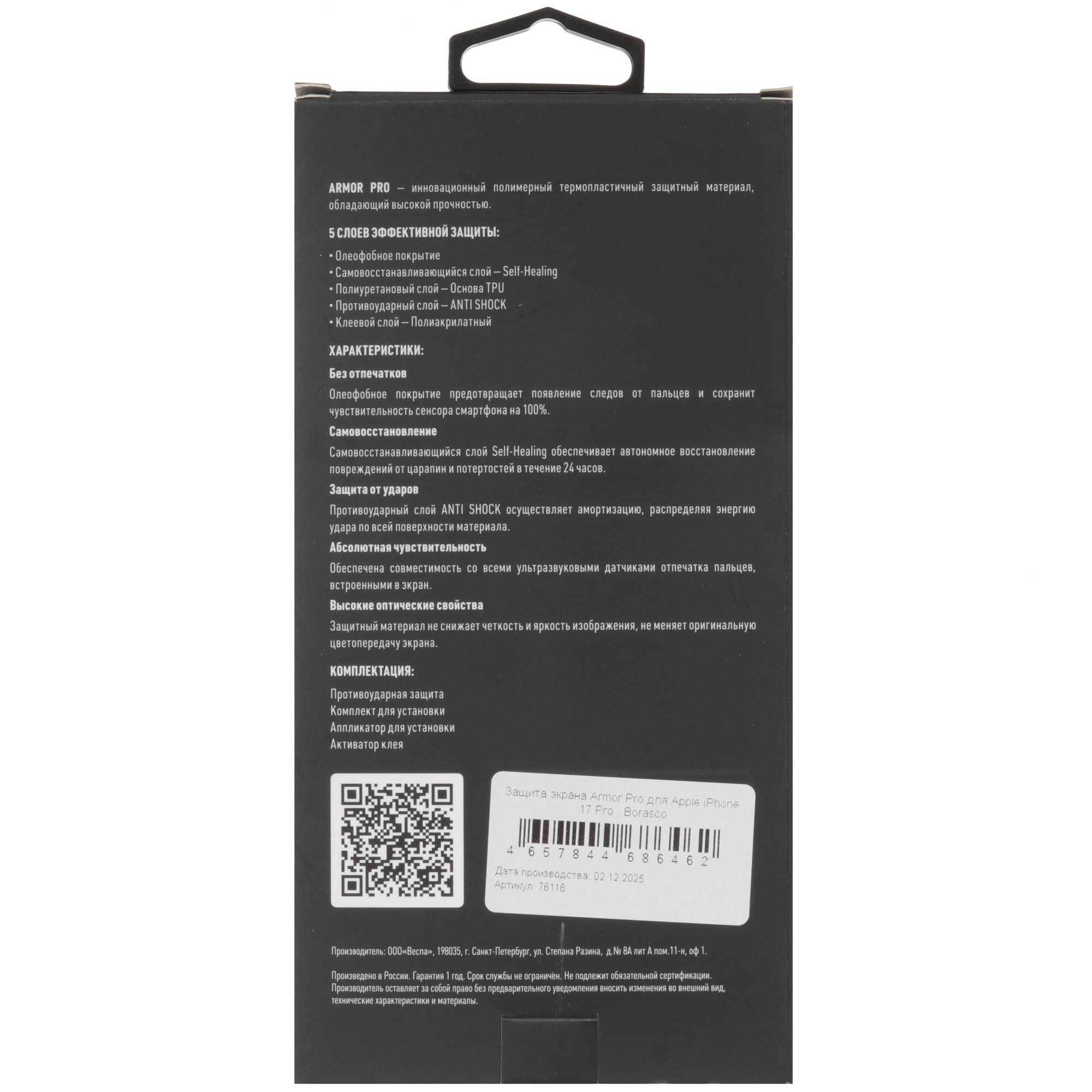 Пленка защитная BoraSCO для Apple iPhone 17 Pro относится к гидрогелевым. Этот материал способен самовыравниваться, поэтому незначительные царапины и мелкие повреждения затягиваются со временем. Слой ANTI SHOCK Layer и твердость покрытия 6H делают пленку устойчивой к ударам. То есть она защитит экран от повреждений в случае падения на твердую поверхность. В комплекте идут активатор клея, аппликатор и набор для установки.