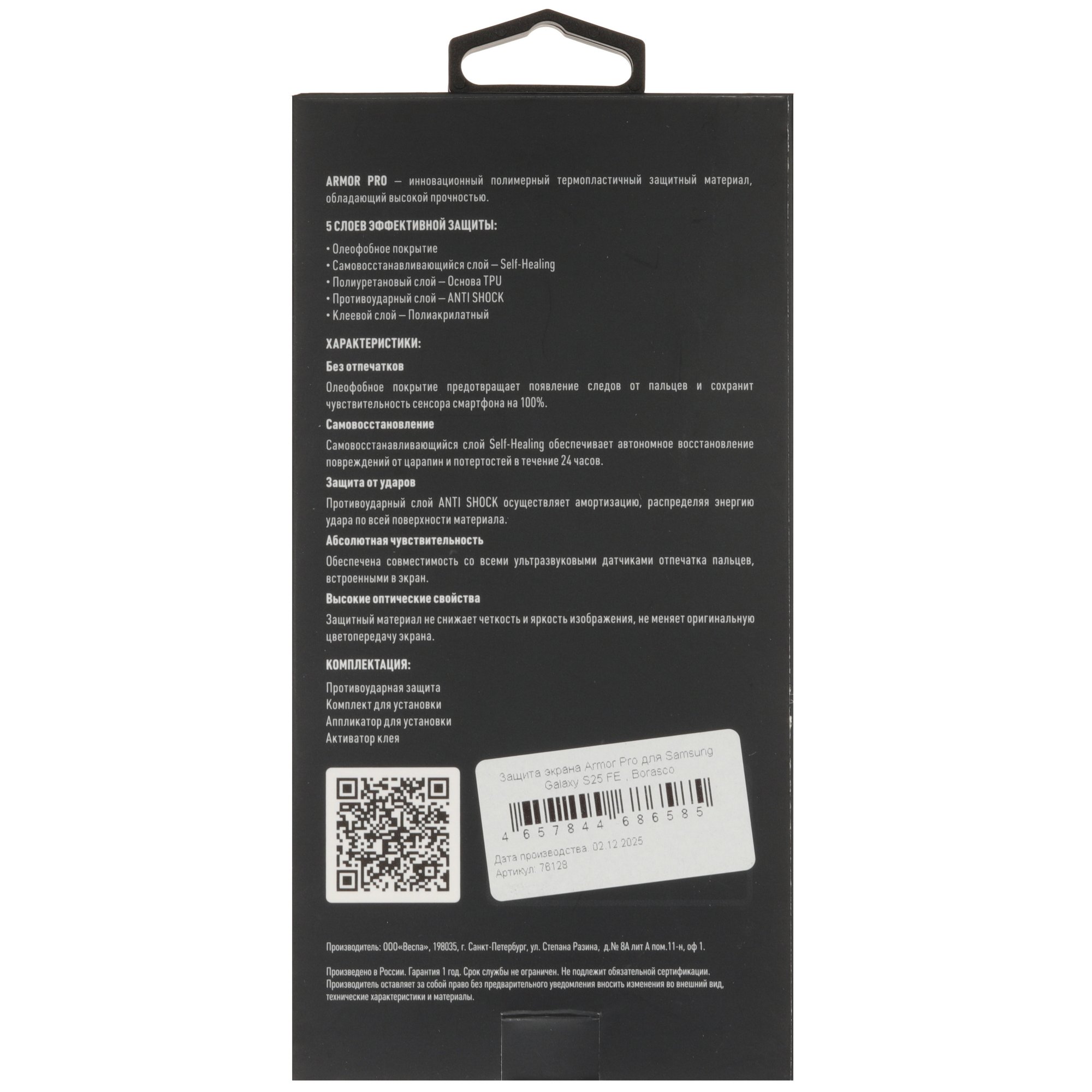 Пленка защитная BoraSCO для Samsung Galaxy S25 FE относится к гидрогелевым. Это самовыравнивающийся материал, поэтому незначительные царапины на нем способны постепенно затягиваться. Благодаря слою ANTI SHOCK Layer и покрытию твердостью 6H пленка устойчива к ударам. Она защитит экран от повреждений в случае падения на твердую поверхность. В комплекте идут активатор клея, аппликатор и набор для установки.