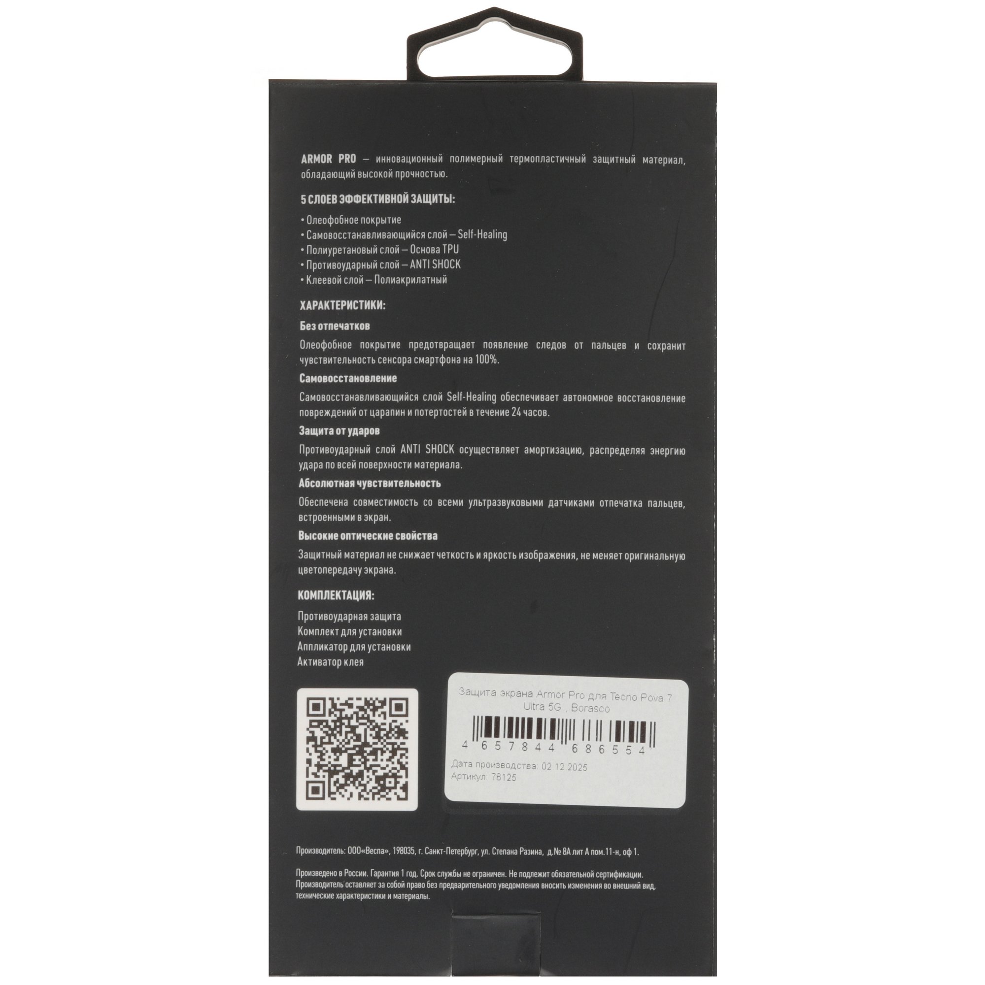 Пленка защитная BoraSCO для Tecno POVA 7 Ultra 5G относится к гидрогелевым. Этот материал способен самовыравниваться, поэтому незначительные царапины и мелкие повреждения затягиваются со временем. Слой ANTI SHOCK Layer и твердость покрытия 6H делают пленку устойчивой к ударам. То есть она защитит экран от повреждений в случае падения на твердую поверхность. В комплекте идут активатор клея, аппликатор и набор для установки.