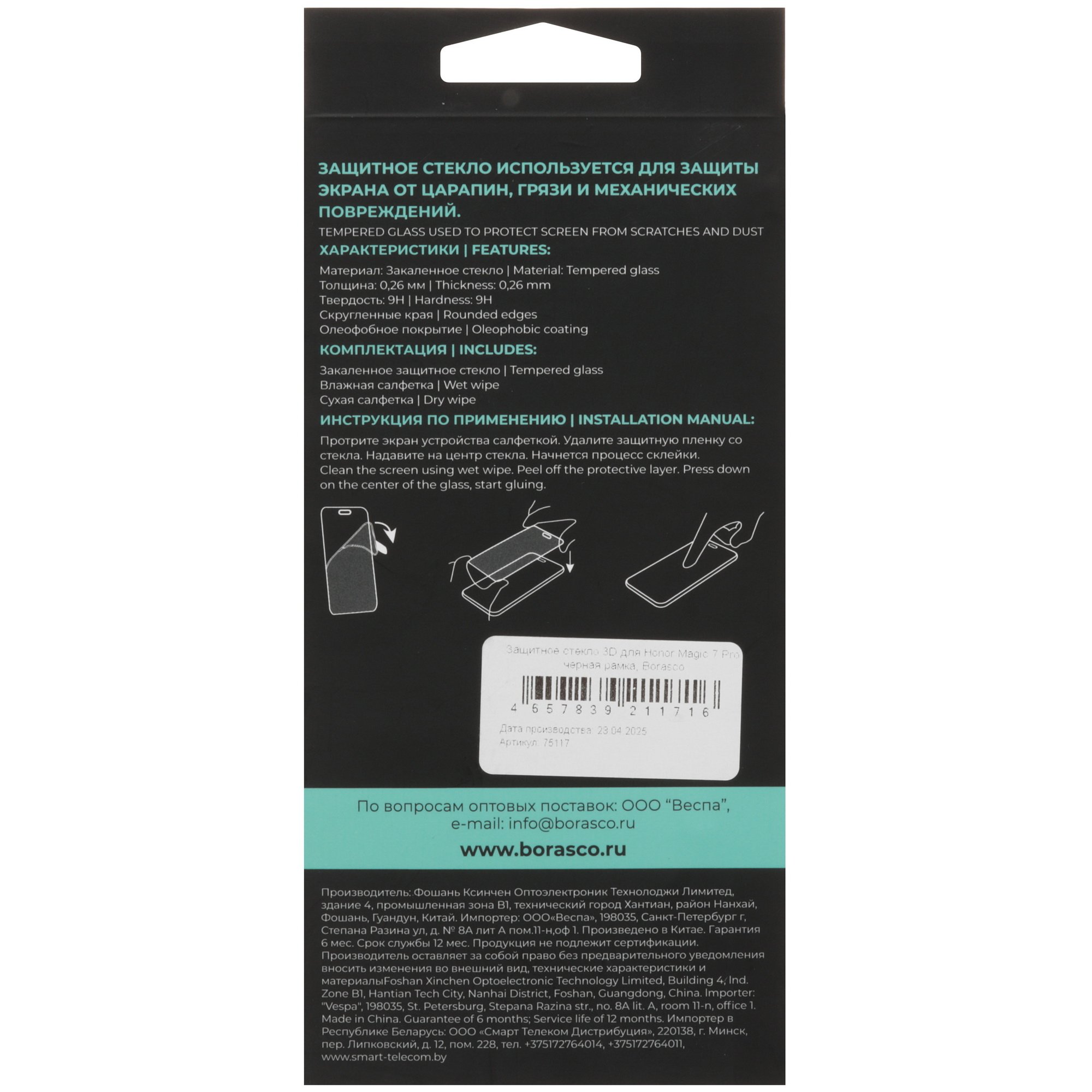 Защитное стекло BoraSCO для экрана HONOR Magic 7 Pro с закругленными краями 3D и черной рамкой плотно прилегает и не отстает по краям. После снятия покрытие не оставляет на дисплее липких следов. Аксессуар идет в комплекте с влажной и сухой салфетками для очистки экрана от загрязнений и протиркой перед установкой стекла.