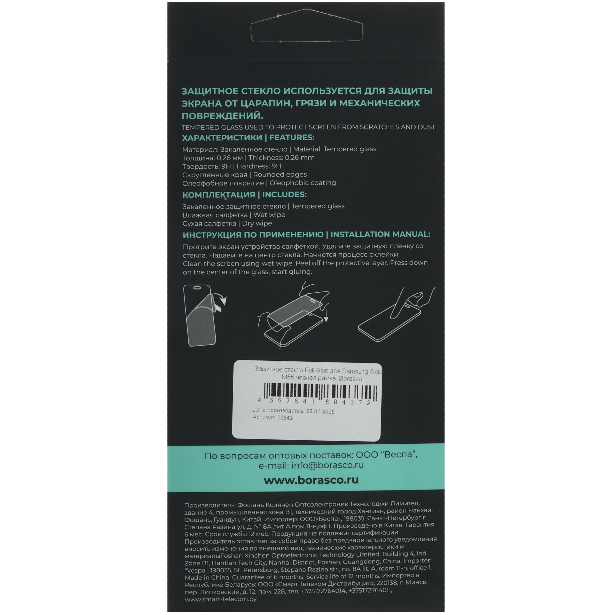 Защитное стекло BoraSCO для экрана Samsung Galaxy M55 типа 2.5D оснащено слегка закругленными краями для плотного прилегания к поверхности. Черная рамка делает изделие менее заметным. Клей по всей поверхности упрощает удаление пузырьков воздуха для плотного прилегания стекла и получения полностью прозрачного покрытия. Аксессуар с твердостью 9H оберегает дисплей от потертостей и царапин, появления сколов и трещин при случайных ударах.