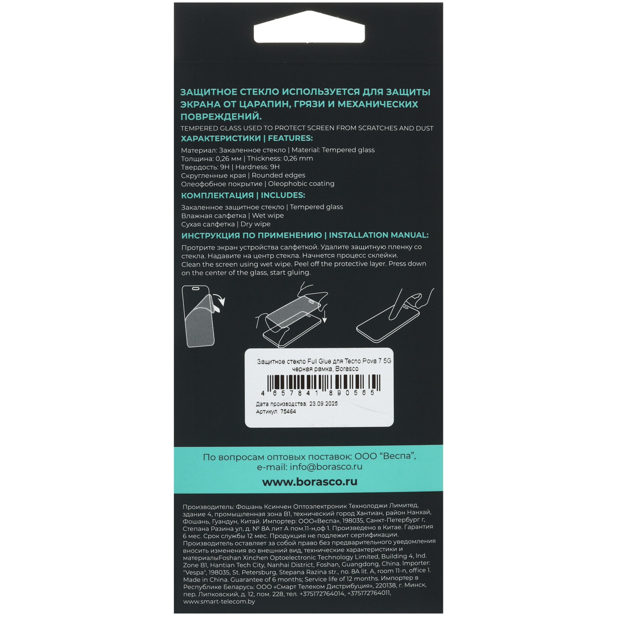 Защитное стекло BoraSCO для экрана Tecno POVA 7 5G типа 2.5D оснащено слегка закругленными краями для плотного прилегания к поверхности. Черная рамка делает изделие менее заметным. Аксессуар с твердостью 9H оберегает дисплей от потертостей и царапин, появления сколов и трещин при случайных ударах.
