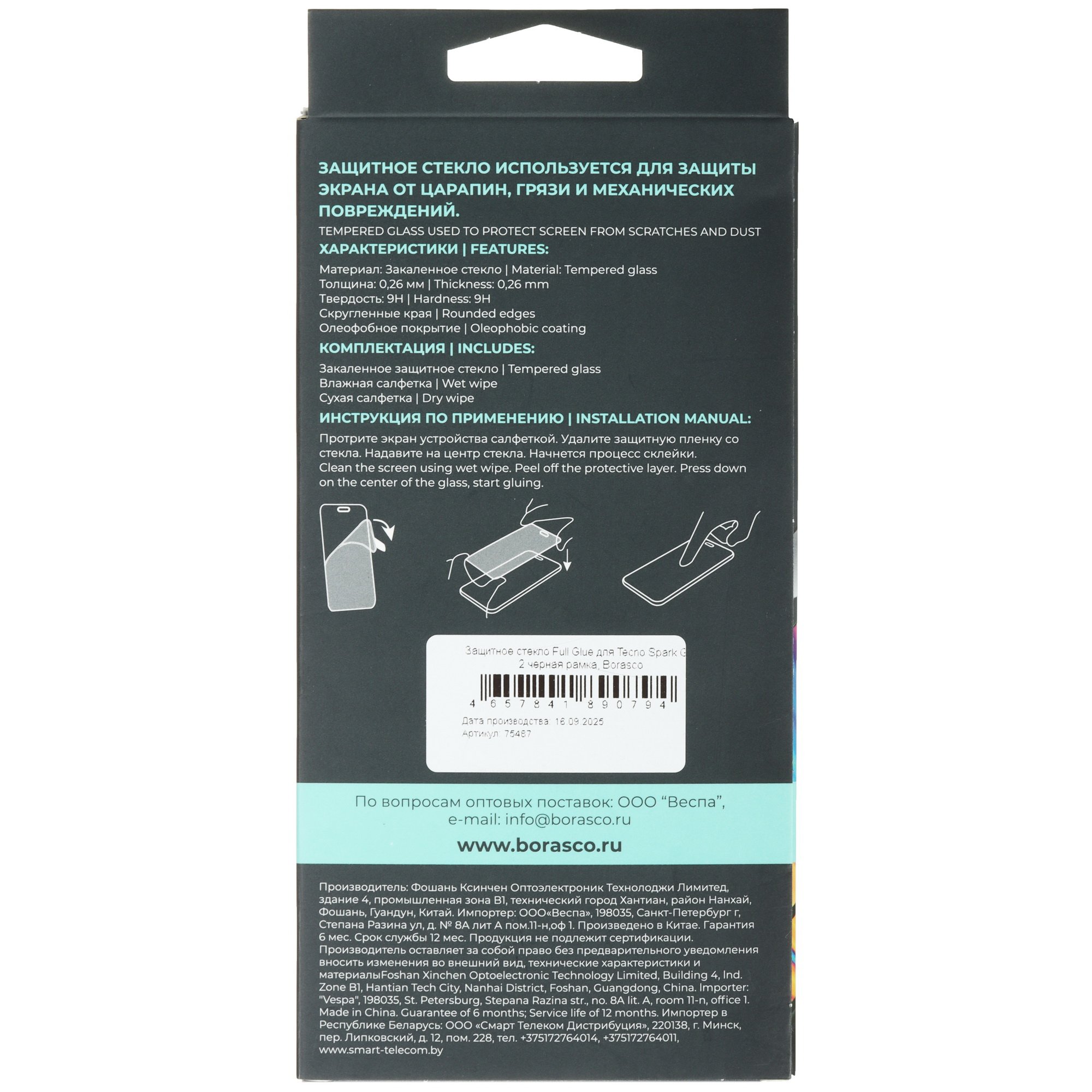 Защитное стекло BoraSCO для экрана Tecno SPARK GO 2 типа 2.5D оснащено слегка закругленными краями для плотного прилегания к поверхности. Черная рамка делает изделие менее заметным. Аксессуар с твердостью 9H оберегает дисплей от потертостей и царапин, появления сколов и трещин при случайных ударах.