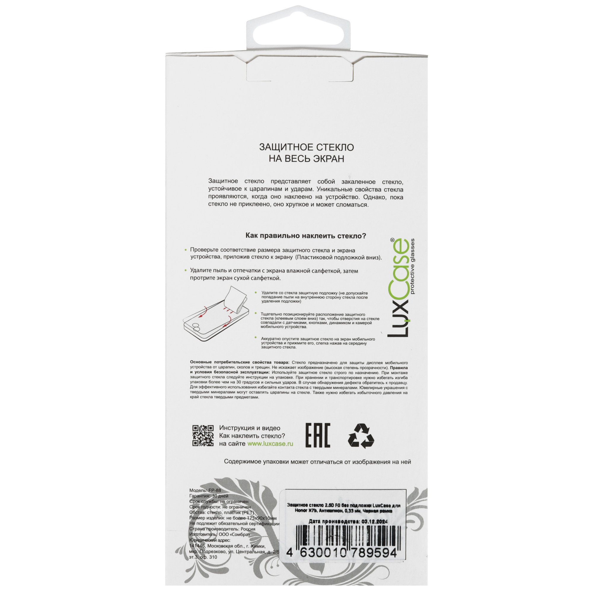 Защитное стекло LuxCase для экрана HONOR X7b с черной рамкой подходит для устройств с диагональю 6.8". Набор состоит из одного изделия с салфетками для очистки дисплея и даст-стикером. Стекло оберегает экран от появления царапин, сколов и прочих повреждений. Гладкое олеофобное покрытие позволяет легко удалить с поверхности брызги и отпечатки пальцев.