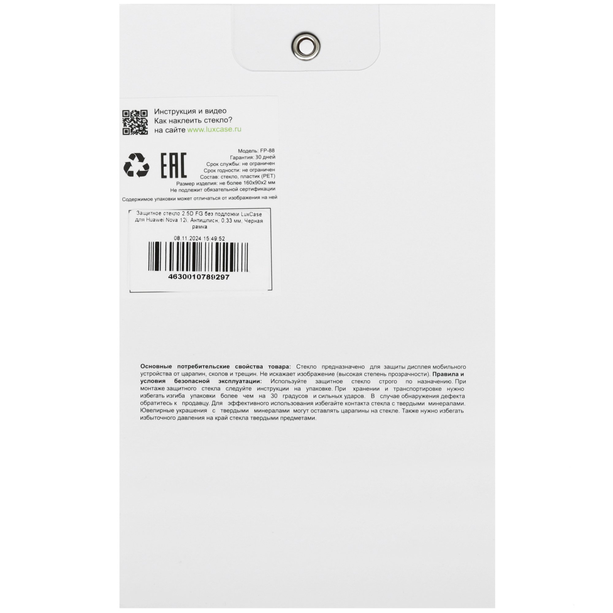 LuxCase для HUAWEI nova 12i/ 13i идет в комплекте с сухой и влажной салфетками для подготовки экрана. Даст-стикер помогает удерживать стекло с внешней стороны для точной установки. Изделие 2.5D со слегка закругленными краями и черной рамкой выглядит незаметно даже при отсутствии чехла на устройстве. Клеевая основа не дает стеклу отклеиваться по краям и не оставляет липких следов при снятии аксессуара.