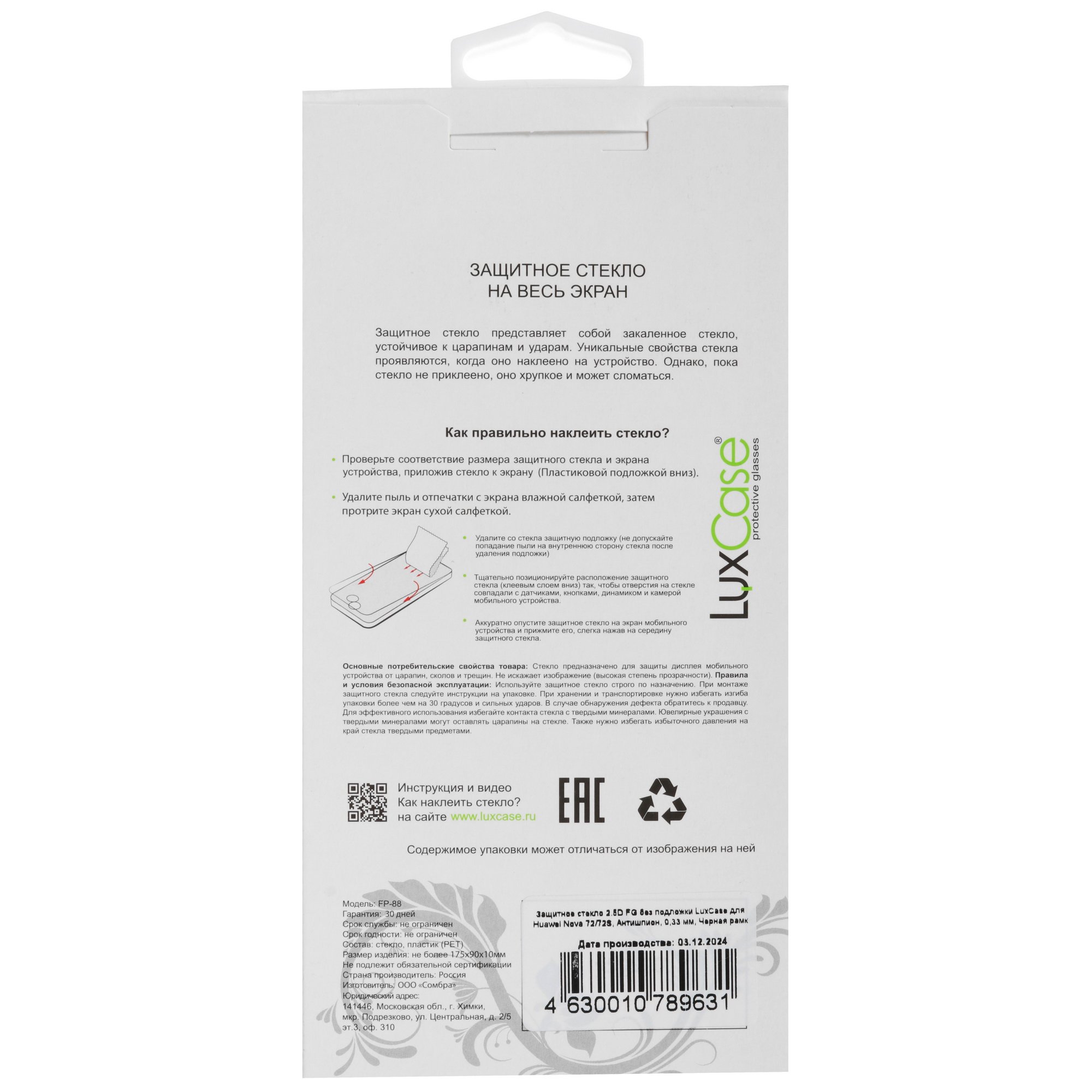 LuxCase для HUAWEI nova Y63/ Y72/ Y72S идет в комплекте с сухой и влажной салфетками для подготовки экрана. Даст-стикер помогает удерживать стекло с внешней стороны для точной установки. Изделие 2.5D со слегка закругленными краями и черной рамкой выглядит незаметно даже при отсутствии чехла на устройстве. Клеевая основа не дает стеклу отклеиваться по краям и не оставляет липких следов при снятии аксессуара.