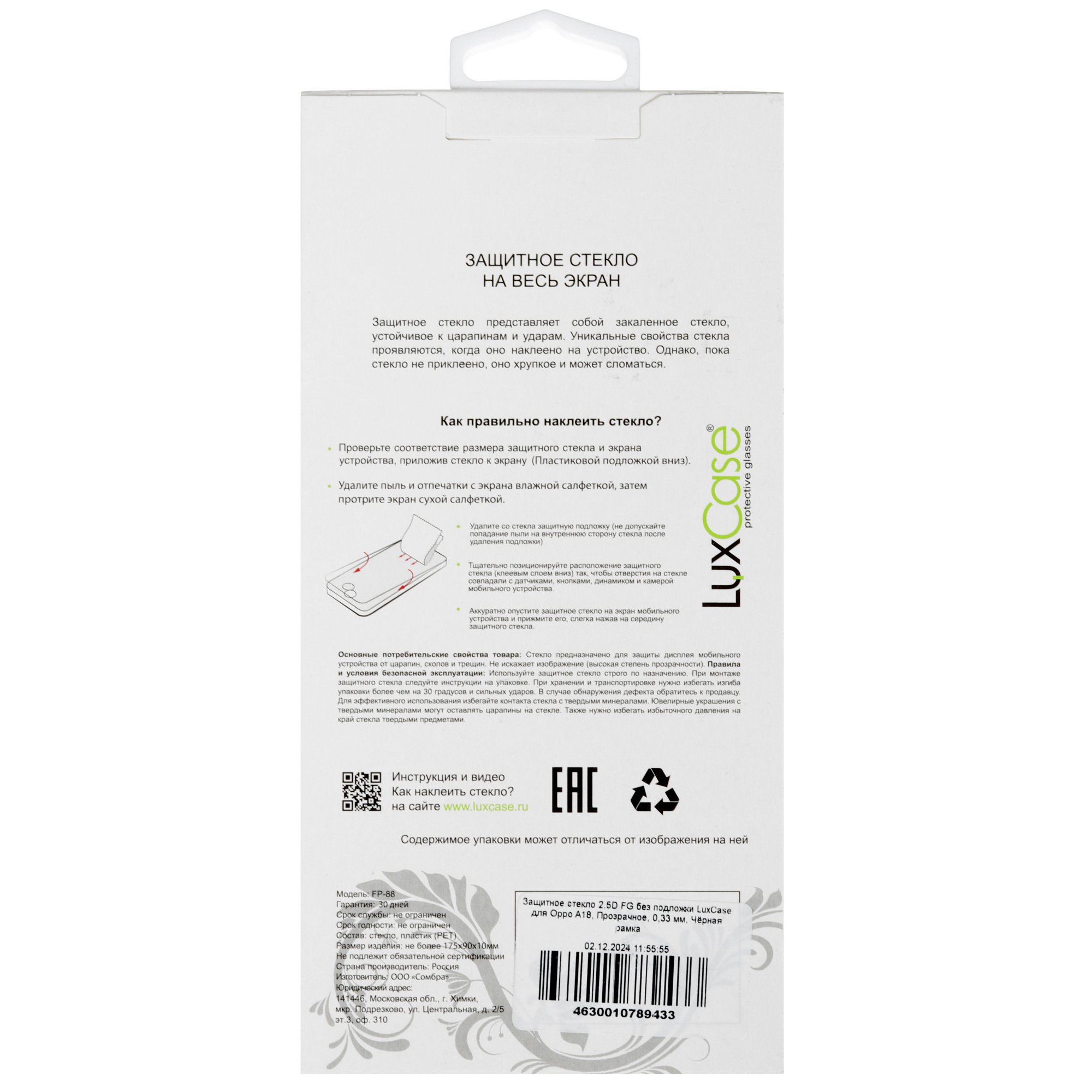 LuxCase для OPPO A18 идет в комплекте с сухой и влажной салфетками для подготовки экрана. Изделие 2.5D со слегка закругленными краями и черной рамкой выглядит незаметно даже при отсутствии чехла на устройстве. Клеевая основа нанесена только на рамку для плотного прилегания по краям.