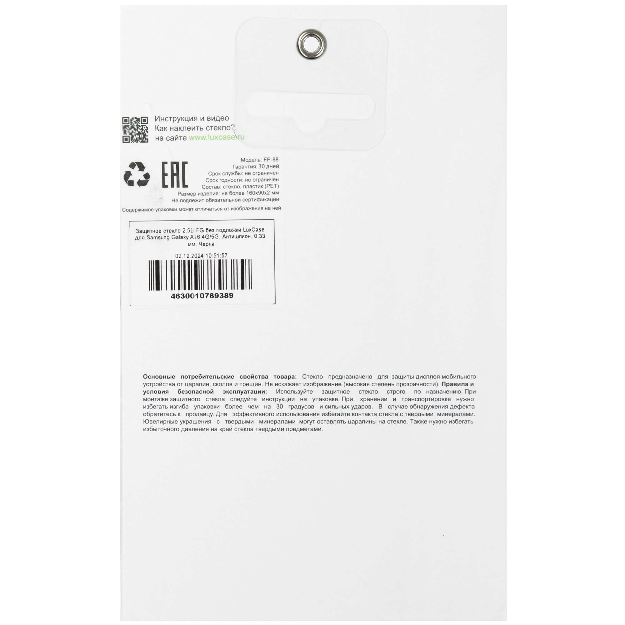 Защитное стекло LuxCase для экрана Samsung Galaxy A16 4G/ 5G типа 2.5D оснащено слегка скругленными краями. Черная рамка делает покрытие незаметным на оригинальном дисплее даже при отсутствии на устройстве отвлекающего внимание чехла. Гладкий олеофобный слой не дает загрязнениям въедаться в поверхность для простоты их удаления без следов и разводов.