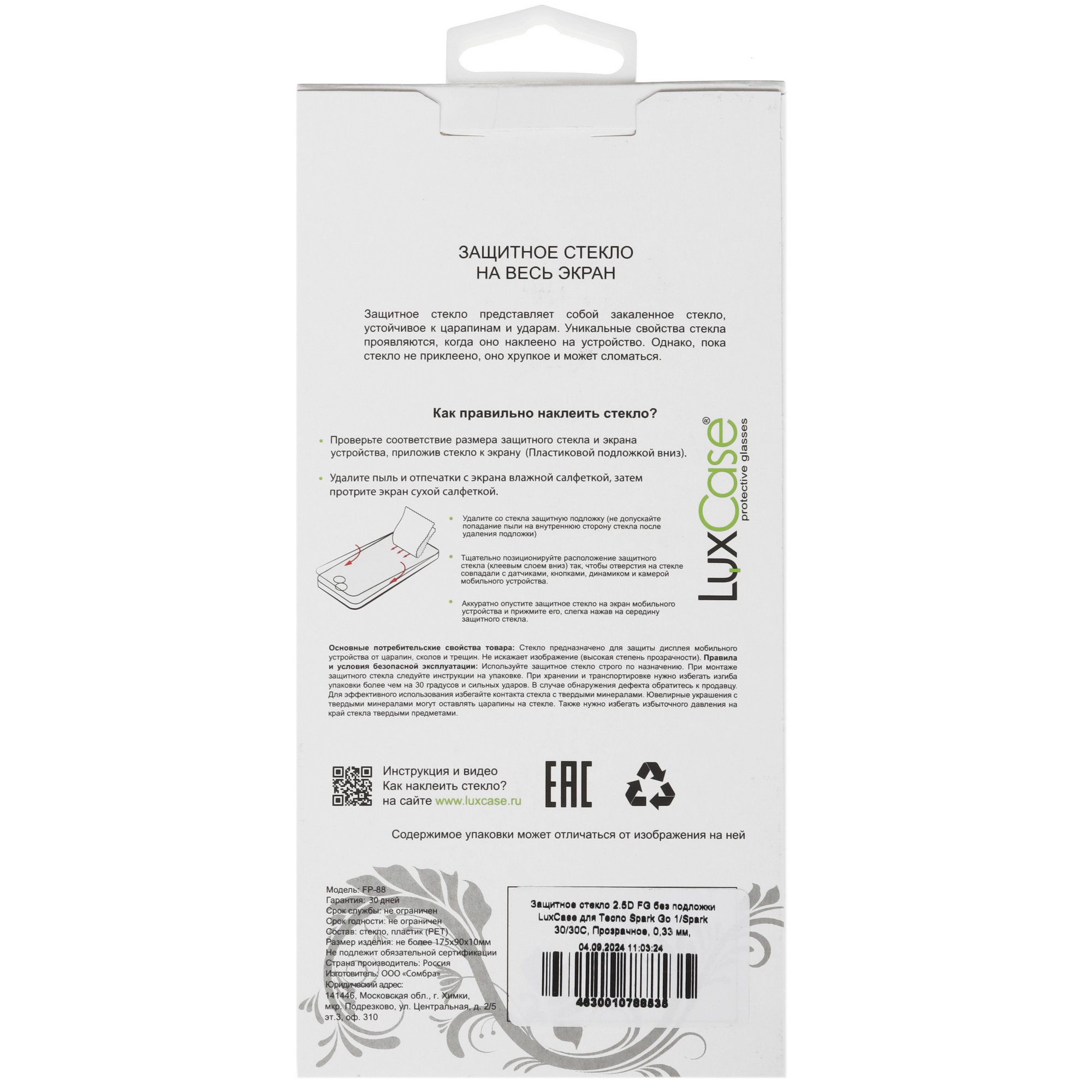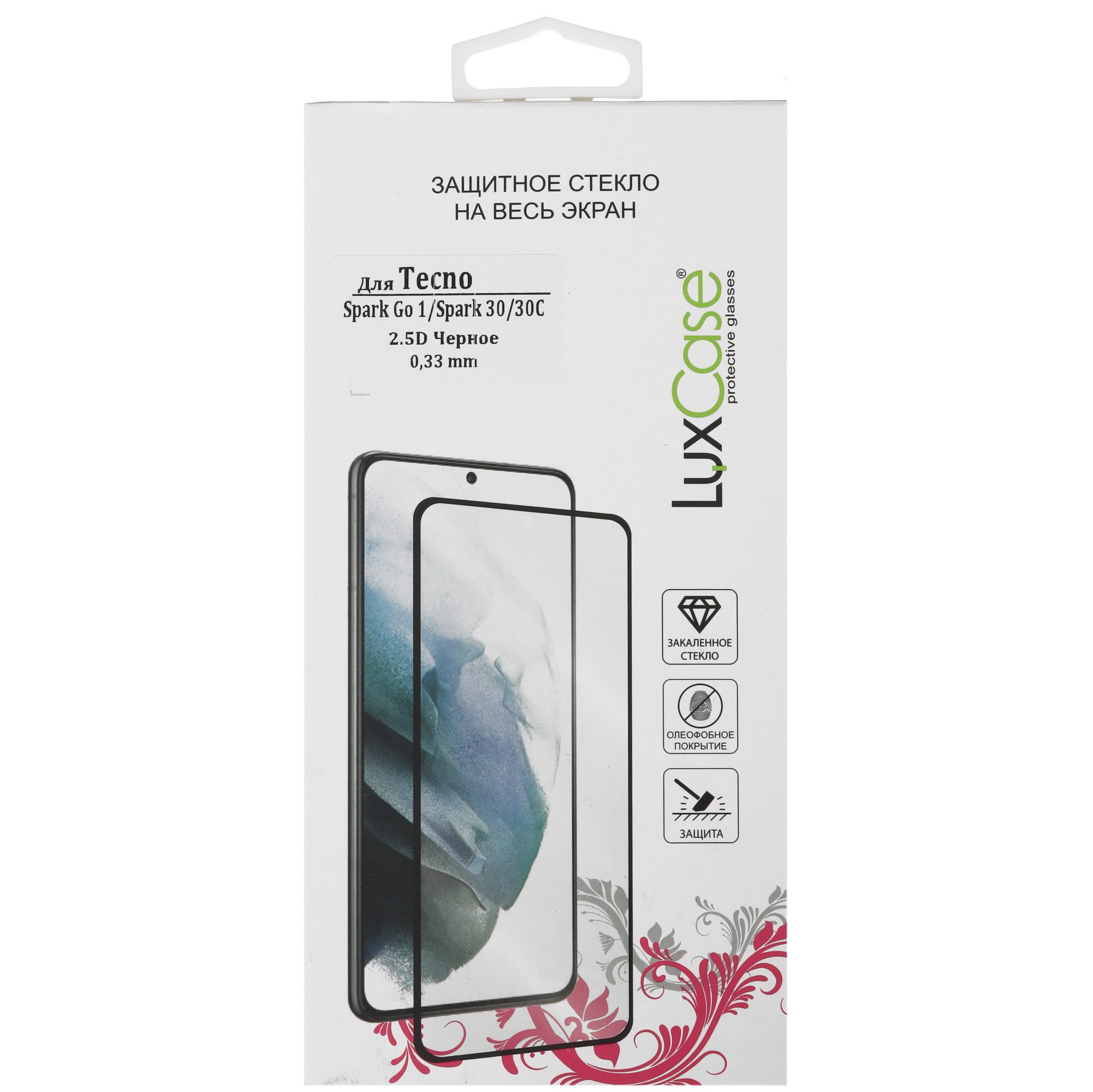 Защитное стекло LuxCase Tecno SPARK GO 1/ SPARK 30/ 30C с черной рамкой получило олеофобное покрытие, которое отталкивает пыль, грязь, капли воды, масло. Со стеклянной поверхности легко стираются следы от отпечатков пальцев и другие загрязнения с помощью влажной или сухой салфетки.