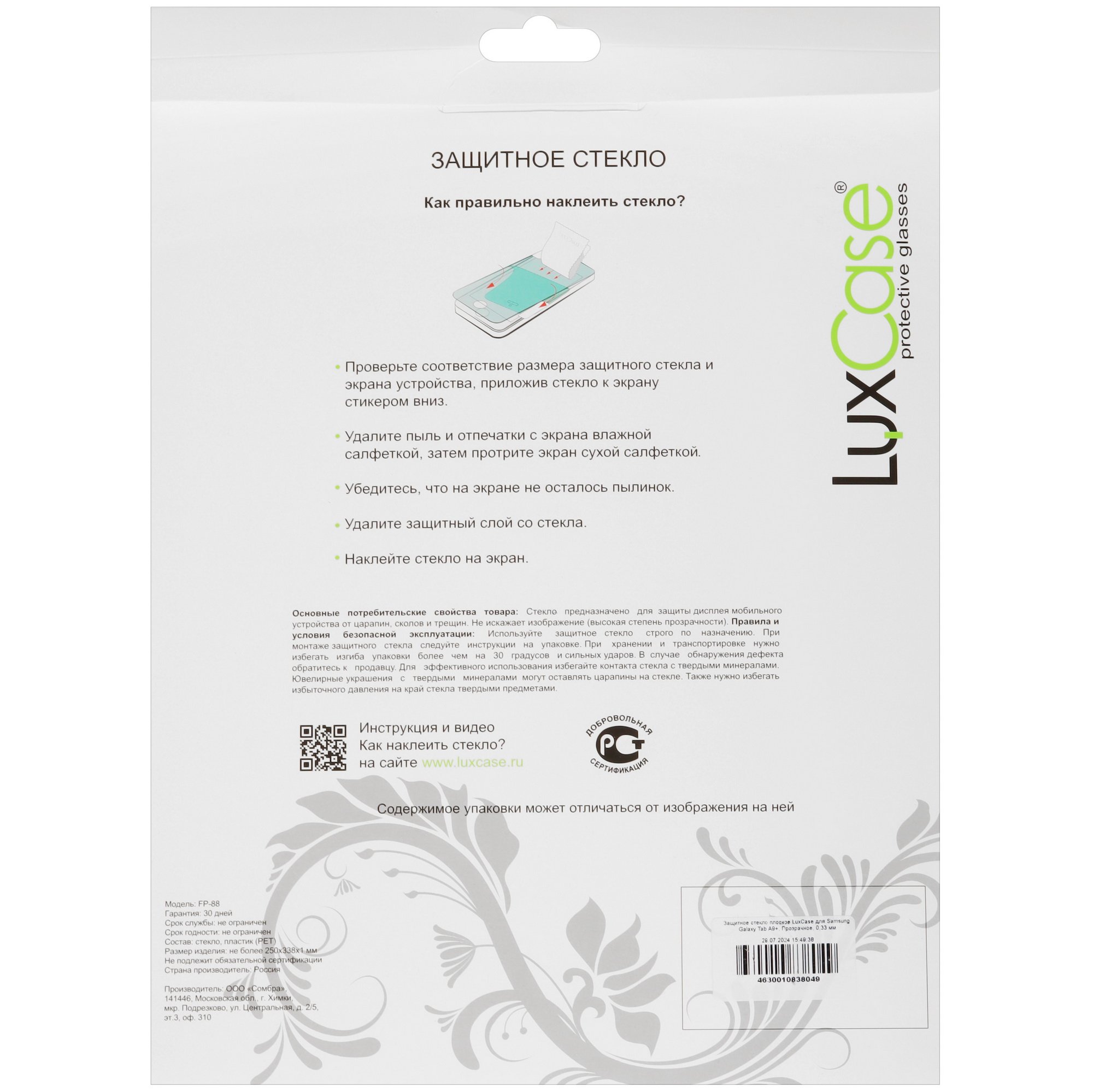 Защитное гибридное стекло LuxCase для Samsung Galaxy Tab A9+/ EdPad соответствует дизайну дисплея с диагональю 11 дюймов. Защитное средство отличается полной прозрачностью и не искажает изображение на экране мобильного устройства. Оно приклеивается на поверхность предварительно очищенного от жировых следов и пыли экрана за счет клеевого слоя, которым покрыта одна из сторон аксессуара. Средства для очистки дисплея при приклеивании входят в комплект со стеклом.